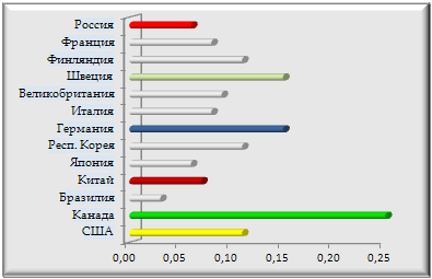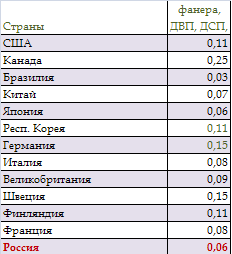 Отрасли по химической и химико-механической переработке древесины потребили 21,3% объема заготовленной древесины. Это значительно меньше, чем в странах с высокоразвитым лесным сектором. Для сравнения, в США доля химической и химико-механической переработки составляет 76,2%, в Финляндия – 84,0%, в Канаде – 69,0% объема лесозаготовок. Таблица 5. Душевое потребление основных лесоматериалов в ведущих лесопромышленных странах мира и в Российской Федерации