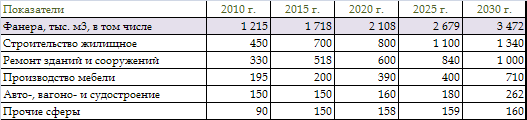 В соответствии с прогнозным сценарием ФАО рост производства фанеры увеличится с 2,7 млн. м3 в 2010 году в 1,5–2,1 раза к 2030 году. Экспорт фанеры рассчитан с учетом ожидаемого спроса на рынках основных импортеров, включая США, Египет и страны Евросоюза. Потребности внутреннего рынка будут обеспечиваться за счет собственного производства при незначительном импорте. Спрос на фанеру к 2030 году в Российской Федерации по сравнению с 2010 годом возрастет в 2,0 раза, а на древесные плиты – в 1,6 раз. Это значительно увеличит производство и потребление большеформатной фанеры, ориентированно-стружечных плит (ОСП) и древесно-волокнистых плит средней плотности (МДФ). Если в настоящее время в Российской Федерации доля большеформатной фанеры незначительна, а плиты ОСП вообще не выпускаются, то в 2030 году выпуск плит МДФ увеличится в 2,2 раза, а производство плит ОСП превысит 2 млн. м3. Основными сферами потребления фанеры, плит МДФ и ОСП являются строительство, мебель, реклама, выставки, машиностроение и контейнеростроение. Таблица 2.Внутренний спрос на фанеру по основным сферам потребления