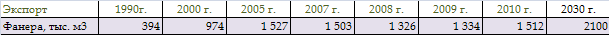 Рис. 2.Прогноз ввода нового жилья в целом (по площади, в млн м2) а также строительство малоэтажных жилых домов в том числе характеризует следующая диаграмма. Нового жилья по прогнозам ФАО в 2030 году будет введено втрое больше, чем в 2010 году. Причем строительство малоэтажных жилых домов будет расти опережающими темпами – рост в 2030 г. к 2010 г. составит 4,2 раза. Интересно отметить, что по итогам 2010 года доля ввода малоэтажных жилых домов по площади от всей площади возведенного нового жилья составила 44%, к 2030 году этот показатель вырастет до 62%. Причем пик строительства малоэтажек будет приходиться на 2020-е годы. Доля строительства малоэтажных жилых домов в эти годы превысит 70% от всей площади возведенного жилья. Экспорт фанеры Спрос на листовые древесные материалы: фанеру, древесно-стружечные и древесно-волокнистые плиты в настоящее время в мире и Российской Федерации развивается динамично. В перспективном периоде до 2030 года эта тенденция не изменится. Спрос на произведенные в Российской Федерации лесоматериалы на внешних рынках к 2030 году также не претерпит значительных изменений и составит: по фанере – 2 140 тыс. м3 Таблица 4