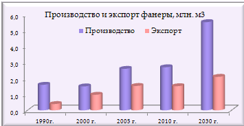 Прогноз уровня выпуска и экспорта фанеры Развитие производства фанеры клееной в прогнозируемый период будут обеспечивать следующие факторы: реализация приоритетных инвестиционных проектов и ввод новых производственных мощностей; расширение ассортимента выпускаемой продукции с улучшенными потребительскими свойствами, повышенной огнестойкостью, биостойкостью и др.; увеличение доли производства большеформатной фанеры; освоение новых технологий производства хвойной фанеры, в том числе из лиственницы; освоение производства фанеры на основе использования экологически чистых связующих материалов; увеличение заводской переработки фанеры в конечную продукцию. В соответствии с инновационным сценарием производство фанеры клееной к 2030 году увеличится на 2,84 млн. м3, или в 2,1 раза, и составит 5,53 млн. м3. Темпы роста объемов экспорта фанеры клееной в период до 2030 года рассчитаны с учетом роста потенциального спроса на эту продукцию на рынках основных импортеров, включая США, Египет, страны Евросоюза. При инновационном сценарии экспорт фанеры клееной к 2030 году увеличится на 0,6 млн. м3, или на 41,5%, и составит 2,1 млн. м3. Прогноз потребления фанеры клееной исходит из предпосылок, что основные потребности внутреннего рынка в перспективный период будут обеспечиваться, главным образом, за счет собственного производства, при относительно небольшой доле импортных поставок. В 2030 году потребление фанеры клееной по инновационному сценарию развития увеличится на 2,2 млн. м3 (в 2,9 раза) и составит 3,47 млн. м3. составит 40,0 млн. м3.