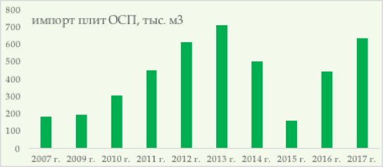 Импортозамещение плит OSB, которое произошло за последние пять лет наглядно отражает возможности развития собственного производства в стране. Первое отечественное производство OSB было официально запущено на Нововятском лыжном комбинате летом 2012 г. Месяцем позже первую партию плит OSB выпустил мини-завод «Хиллман OSB». Компания ДОК «Калевала осуществила запуск первой очереди по выпуску таких плит в июне 2013 года. В 2014 году на российском рынке появилось крупное предприятие австрийской компании «Кроношпан» в г. Егорьевск Московской области. В июне 2016 года в селе Сычево Курганской области начал работать еще небольшой завод. На рынке плит ОСП в сентябре 2016 года в городе Торжке Тверской области начало работать еще одно крупное предприятие «Таллион Арбор». Таможенная служба информирует о объемах перемещаемых товаров. Код ТН ВЭД 441012 «Плиты с ориентированной стружкой (OSB) из древесины»: Темпы прироста импорта плит OSB были особенно высокими после кризиса 2008-2009 годов. Уже в 2010 году импортеры с верхом отыграли потерянные в кризис объемы, а в 2011-2013 годы поставки продолжали расти: в 2011 году было импортировано плит OSB согласно информация ФТС РФ 450,6 тыс. м3, а в 2013 году уже 710,6 тыс. м3, что на 16% превышает объем поставок в 2012 году. 2013 год - пик импортных поставок. Однако уже в 2014 году импортные поставки плит OSB упали на треть до 499 тыс. м3, что было обусловлено резким скачком доллара по отношению к рублю и соответственно удорожанием импорта для российского потребителя. В этом же году Правительство России создает ряд постановлений, направленных на импортозамещение ввозимых товаров – что предполагает усиление поддержки отечественного производителя со стороны государства. Важно отметить, что начиная с 2014 года значительная доля импорта приходится на белорусскую продукцию, поскольку в этом году начал работать завод «Кроношпан» под Могилевом. Сегодня белорусские плиты хорошо продаются на российском рынке в силу высокого качества и приемлемой цены.