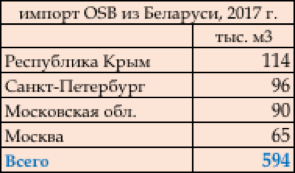 Итак, основным импортером плит OSB на российский рынок, начиная с 2016 года выступает завод, расположенный в Беларуси - «Кроношпан» под Могилевом. По итогам 2017 года на долю этой страны приходится 94% совокупного объема импортных плит OSB. В 2017 году наиболее высокие объемы плит OSB из Беларуси поступили на рынок республики Крым – импорт составил 114 тыс. м3, доля рынка 19%. В Санкт-Петербург было отгружено около 96 тыс. м3 OSB, что соответствует 16%. Московская область и Москва закупила OSB компании «Кроношпан»-Могилев 90 тыс. м3 и 65 тыс. м3 соответственно.