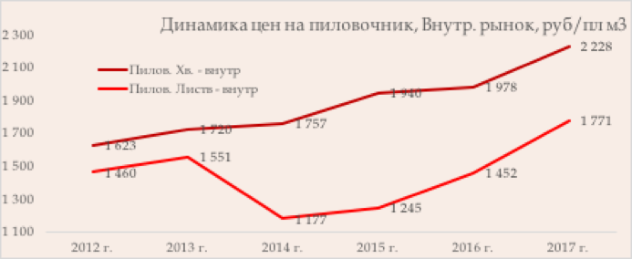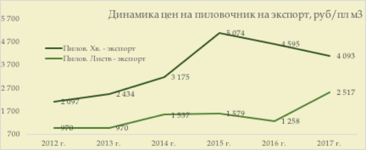 По состоянию на декабрь 2017 года средневзвешенные цены производителей в целом по России для реализации хвойного пиловочника конечным потребителям на внутреннем рынкесоответствовали уровню 2228 руб. за пл. м3, что на 13% выше уровня предыдущего года. Пиловочник лиственный подорожал за год на 22% до 1771 руб. за пл. м3. Средние цены экспорта Экспортом пиловочного сырья из России в основном охвачены регионы Сибири. В отличии от внутренних цен, экспортные цены на пиловочное сырье росли более высокими темпами. Так за период с 2010 года пиловочник лиственных пород древесины, предназначенный на экспорт подрожал более чем в 2,5 раза. Пиловочное сырье хвойных пород древесины увеличилось в цене за этот период вдвое. Экспортные круглые лесоматериалы лиственных пород древесины, предназначенные для лесопиления за 2017 год подорожали вдвое до 2517 руб. за пл. м3. Заметим, что последние пять лет объем лесозаготовительных работ по вывозке круглого леса лиственных пород растет с опережающими темпами относительно динамики вывозки кругляка хвойных пород древесины. Экспортные цены на хвойный пиловочник упали на 11% до уровня 4093 руб за пл м3.