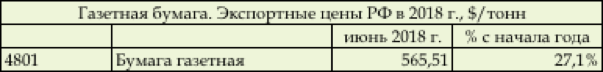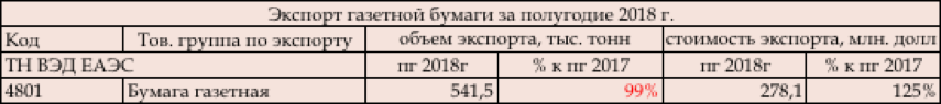 За период с начала года по состоянию на июнь 2018 г. газетная бумага из России выросла в цене почти на 27%, что позволило увеличить стоимость поставок. Российские предприятия в I полугодии 2018 года получили валютную выручку от реализации газетной бумаги на мировом рынке на сумму 278,1 млн. долл., что на 25% больше, чем год назад за такой же период. Доля экспорта газетной бумаги в стоимостном выражении составила 4% в совокупной валютной выручке лесной промышленности по итогам полугодя 2018 г.