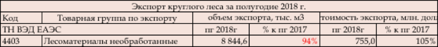 Объемы экспортных поставок круглого леса из России падают второй год подряд. Так в 2017 году поставки упали на 3%. По итогам полугодия 2018 года вновь прослеживается отрицательная динамика – отгрузки снижены в сравнении в полугодием 2017 года на 4%. Экспорт лесоматериалов необработанных (код ТН ВЭД 4403) в натуральном выражении по итогам полугодия 2018 года согласно статистике ФТС РФ составил 8844,6 тыс. м3.