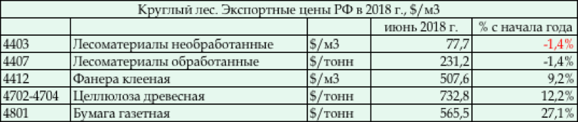 Характеризуя динамику экспортных поставок лесной индустрии России за первое полугодие 2018 года, отметим, что по таким экспортным товарным группам отрасли, как газетная бумага, целлюлоза и фанера зафиксировано увеличение внешнеторговых цен за период с начала года. Экспортные отгрузки круглого леса и пиломатериалов по состоянию на июнь 2018 г. за период с начала года подешевели на 1,4% по каждой позиции. В июне 2018 года экспортные лесоматериалы необработанные в среднем стоили 77,7 $/м3, лесоматериалы обработанные в июне 2018 года торговались по ценам 231,2 $/тонн. Наиболее существенно за рассматриваемый период выросли экспортные цены на поставки газетной бумаги – рост составил 27%, достигнув уровня 565,5 $/тонну в июне 2018 г. Экспорт древесной целлюлозы вырос в цене за период с начала года на 12,2%, составив в среднем 732,8 $/тонн в июне 2018 г. Уровень цен на экспортную фанеру из России по состоянию на июнь 2018 г. в сравнении с декабрем 2017 г. увеличился на 9,2%, составив 507,6 $/м3.