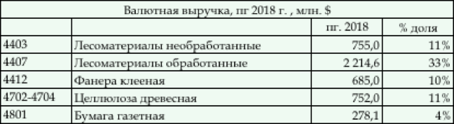 В число ведущей экспортной продукции Лесной отрасли России входят такие товарные группы, как лесоматериалы необработанные (круглый лес), лесоматериалы обработанные (пиломатериалы), фанера клееная, целлюлоза древесная и газетная бумага – на долю данной группы товаров приходится почти 70% всей валютной выручки отрасли. По итогам полугодия 2018 года по-прежнему наибольший вес в стоимости всей экспортной продукции Лесной индустрии страны принадлежит экспорту пиломатериалов, что составило 33% от суммарной выручки, или 2215 млн. долл. Почти одинаковая валютная выручка от экспорта за полгода 2918 года была получена за счет реализации на мировом рынке таких товарных групп, как круглый лес и целлюлоза – 755 млн. долл. и 752 млн. долл. соответственно. Немного меньше доходов принес экспорт фанеры – за полгода 2018 г. было получено 685 млн. долл., что составило 10% в совокупной выручке отрасли. Поставки газетной бумаги также входят в число традиционных ведущих экспортных товаров. Доходы от реализации отечественной газетной бумаги за полгода 2018 года составили 278 млн. долл., что соответствует 4% всей выручки лесной промышленности.