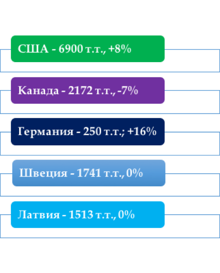 Канада выступает вторым крупным производителем пеллет, занимая долю 9%. Важно напомнить, что в 2016 году в этой стране был зафиксирован рекордно высокий объем выпуска топливных гранул из древесных отходов – производство выросло на 38%. В 2017 году канадские производители выпустили около 2,7 млн. тонн пеллет, что на 7% меньше, чем год назад. Напомним, что в начале 2014 года завод в городе Вава (Канада) вновь запустил производство пеллет. Rentech Incorporated преобразовало завод в производственный объект по выпуску топливных древесных гранул. И уже в 2016 году было выпущено уже 360 тыс. тонн данной продукции. На внешние рынки из Канады в 2017 году было отгружено почти 80% выпущенной в стране пеллетной продукции. Пеллетная индустрия в Германии в течение предыдущих четырех лет демонстрировала снижение объемов выпуска пеллет, и только в 2017 году за счет 16-ти процентного роста выпуска, утраченные объемы промышленных пеллет восстановились. Сегодня на долю Германии приходится 7% совокупного выпуска пеллет, что составляет 2,25 млн. тонн. 28 тысяч биотопливных котлов было установлено в этой стране в 2017 году. Нужно отметить, в ФРГ каждый домовладелец получает субсидию от государства на перевод котельных на биомассу или другие виды возобновляемого топлива. Уход от ископаемых видов топлива снижает выбросы СО2 в атмосферу и улучшает экологию Европы.Почти 20% от объема производства пеллет в Германии было отправлено на экспорт. Неизменными остались объемы производства пеллет по итогам 2017 года в Швеции – уровень выпуска соответствовал 1,74 млн. тонн. Наиболее высокий рост выпуска пеллет в этой стране на уровне 26% был зафиксирован в 2013 году. Предприниматели из Швеции в 2017 г. на мировые рынки отправили 11% произведенной пеллетной продукции. Замыкает пятерку мировых лидеров по производству пеллет еще одно государство Евросоюза – Латвия. Пеллетная промышленность Латвии в 2015 голу вышла на рекордный выпуск пеллет за счет 25% роста. В 2017 году производственные показатели остались на уровне предыдущего года и составили свыше 1,5 млн. тонн. Почти вся пелетная продукция, выпущенная на заводах Латвии уходит на внешние рынки. Отмечая динамику выпуска топливных гранул из древесных отходов за 2017 год, следует сказать, что производство пеллет во Франциивновь показало существенный рост. Так за истекший год уровень выпуска древесного биотоплива в гранулах во Франции увеличился на 17% и составил 1,35 млн. тонн. Годом ранее рост составил 21%. На экспорт в 2017 году из Франции было отправлено 14%.