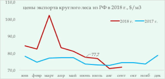 источник ФТС Ведущим импортером пиловочника из России выступает Китай – на рынки Поднебесной уходит более половины всех грузопотоков круглого леса. Лидером по объемам поставок необработанной древесины в КНР в настоящее время выступает Хабаровский край. У России также давнишние внешнеторговые связи с Финляндией. Основу российского экспорта круглого леса в Суоми составляет балансовая березовая древесина, предназначенная для выработки целлюлозы. Рынок стран СНГ по экспорту российского круглого леса представлен в основном такими странами, как Узбекистан и Казахстан. Круглый лес из России, после обвала цен в 2015 г., рос в цене на протяжении двух лет. Напомним, что в в 2016 г. и в 2017 году круглые лесоматериалы из России подорожали в среднем на 5% и 8,5% соответственно. В 2018 году экспортные цены на отечественные круглые лесоматериалы начали понемногу падать. Так, по состоянию на сентябрь 2018 года внешнеторговые цены на круглый лес из России составили 71,8 $/м3, за период с начала года цены упали на 9%.