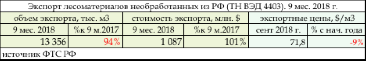 Валютная выручка от экспорта лесоматериалов необработанных из России по итогам 9 мес. 2018 года составила 1087 млн. долл., что на 1% больше, чем год назад за такой же период. Необработанные лесоматериалы входят в число важнейших экспортных товаров России. По уровню валютной выручки, полученной от реализации российского круглого леса на мировых рынках, экспорт данной товарной группы занимает третье место. Так, поставки круглого леса в стоимостном выражении по итогам 9-ти месяцев 2018 года занимают 10,6% от совокупной выручки лесоматериалов. Динамику объемов отгруженной продукции и внешнеторговых цен см. «Инфографика»: https://www.lesonline.ru/news/?id=379372 https://www.lesonline.ru/news/?id=379373 Основные события российского экспортного рынка круглого леса в 2018 году: 1. 21 мая 2018 г. были внесены изменения в ст. 29 Лесного кодекса РФ о временном запрете вывоза деловой древесины, начиная с 2020 года, сроком на десять лет. Данная мера позволит разрешить проблему лесовосстановления, поскольку в этот период будет осуществляться заготовка хвойной древесины в объемах, необходимых только для обеспечения деревообрабатывающей отрасли РФ. См. https://www.lesonline.ru/law/?id=26. 2. В течение 2017 года проводился мониторинг обеспеченности сырьем российских фанерных предприятий. Выявлена отрицательная динамика обеспечения фанерным кряжем перерабатывающих производств и увеличение экспорта данного сырья в Китай. В настоящее время возникает дефицит необходимого сырья. По мнению экспертов, при вывозе сырья на таможне могут возникать ситуации с подменой балансовой древесины на фанкряж, так как в товарной номенклатуре нет четкого разделения бревен по качественным характеристикам. Возникают риски отнесения к одному и тому же коду как балансовой древесины диаметром более 15 см, так и фанерного сырья. В целях недопущения некорректного декларирования подготовлены предложения по ряду дополнений с четким описанием фанерного кряжа и его качественных характеристик. В целях использования сырья для производства фанеры на внутреннем рынке, в июле 2018 г. вышло постановление о введении квот на экспорт фанкряжа. Постановлением № 836 установлены квоты на вывоз березовых бревен длиной более одного метра с диаметром свыше 15 см. См. https://www.lesonline.ru/law/?id=24. 3. В целях сохранения от вырубок таких видов хвойной древесины, как ель аянская, пихта белокорая и лиственница даурская, 14 марта 2018 года вышел приказ Минпромторга, устанавливающий квоты на вывоз данных пород древесины за рубеж. Отметим, что ежегодно на экспорт уходит более 4 млн. м3 древесины перечисленных видов, что составляет примерно 20% от совокупного экспорта круглого леса, вывезенного за границу. В 2018 квоты на вывоз данной древесины получили 12 лесозаготовительных предприятий, список которых см. https://www.lesonline.ru/law/?id=29. 4. Ежегодно в России исчезает лесов в полтора раза больше, чем восстанавливается. 19 июля 2018 года вышел закон, предписывавший обязательное восстановление лесов. Закон вступает в силу с 1 января 2019 года. см.https://www.lesonline.ru/law/?id=27. 5. 2 февраля 2018 года. ФАС России разработал «План мероприятий по развитию биржевых торгов лесоматериалами в РФ». Напомним, что начиная с 2014 года в России начала работать Санкт-Петербургская Международная Товарно-сырьевая Биржа. В настоящее время такие торги осуществляются в Пермском крае, Кировской и Иркутской областях, Удмуртской респ