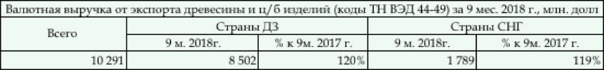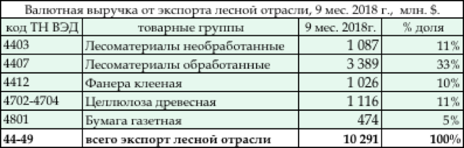Валютная выручка от экспорта лесной промышленности РФ Стоимость экспорта древесины и целлюлозно-бумажных изделий (коды ТН ВЭД 44 – 49) за 9 месяцев 2018 года достигла уровня 10 291 млн. долл., что на 20% больше, чем год назад за такой же период.