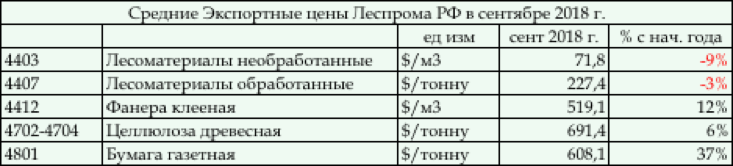 Причем наиболее существенно за рассматриваемый период выросли экспортные цены на поставки газетной бумаги. Экспортные цены на газетную бумагу по состоянию на сентябрь 2018 г. достигли уровня 608,1 $/тонну. За период с начала года цены за газетную бумагу выросли на 37%. Уровень средневзвешенных цен на экспортную фанеру из России по состоянию на сентябрь 2018 г. составили 519,1 $/м3. За период с начала года цены на фанеру выросли на 12%. Товарная целлюлоза, отгруженная на мировые рынки, по состоянию на сентябрь 2018 года стоила в среднем 691,4 $/тонн. За период с начала года цены на целлюлозу выросли на 6%. Снижение цен коснулось таких экспортных товарных групп Леспрома РФ, как обработанные и необработанные лесоматериалы. Более всего за рассматриваемый период подешевели необработанные лесоматериалы. Так, в сентябре 2018 года экспортные лесоматериалы необработанные в среднем стоили 71,8 $/м3, спад с начала года составил 9%. Подешевели в 2018 году и экспортные пиломатериалы. Так, в сентябре 2018 года экспортные лесоматериалы обработанные в среднем стоили 227,4 $/тонну, спад с начала года составил 3%. Фонд развития промышленности одобрил первый заем экспортеру под 1% годовых. Средства будут направлены на организацию деревоперерабатывающего производства в Хабаровском крае, сообщил 13 ноября 2018 г. Минпромторг. https://www.lesonline.ru/news/?id=379523 Источник: ФТС, Минпромторг Е. Дмитриева © http://www.lesonline.ru/analitic/