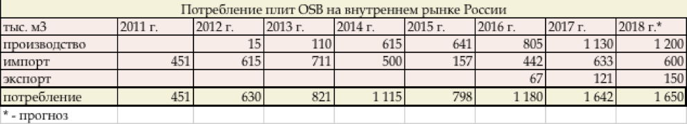 Летом 2012 года в Кировской и Владимирской области было начато отечественное производство OSB. Объемы OSB на первоначальном этапе составили всего 15 тыс. м3. Импорт ОСП в этом году составил 615 тыс. м3. Основными поставщиками плит OSB на российский рынок выступали такие компании, как подразделение компании Kronospan - Bolderaja(Латвия) – до 100 тыс. м3 ОСП; Louisiana Pacific и Norbord (Канада), Egger и Glunz (Германия, Румыния), Kronopol (Польша) и др. Поступали на наш рынок также плиты OSB из Китая, но их качество намного уступает европейским, американским, а теперь уже и российским аналогам. В следующем 2013 году импортные поставки ОСП выросли за год на 15%, достигнув своего максимума за последние десять лет. Начиная с 2013 года на территории России уже работает три предприятия, суммарный выпуск которых по плитам OSB составил 110 тыс. м3. В 2014 году внутренний спрос на OSB в России увеличился еще на 36%. Важно отметить, что в 2014 году начинает работать еще одно крупное предприятие в г. Егорьевск Московской области – совокупные объемы отечественного производства уже достигли уровня 615 тыс. м3. Импорт плит OSB в этот год просел на 30%.Напомним, что падение импорта было обусловлено резким скачком доллара по отношению к рублю и соответствующему удорожанию импортной продукции для российского потребителя. В этом же году Правительство России создает ряд постановлений, направленных на импортозамещение ввозимых товаров – что предполагает усиление поддержки отечественного производителя со стороны государства. В 2015 году закупка плит извне резко сократилась по причине резкого скачка валютных курсов – импорт OSB за этот год сократился втрое и упал до минимума, составив всего 157 тыс. м3. В этом году за счет постепенного освоения производственных мощностей суммарный выпуск OSB на заводах России вырос до 640 тыс. м3. Потребление OSB отечественными предприятиями стройиндустрии и мебельной промышленности в 2015 году упало на 28% до 800 тыс. м3. В 2016 году список предприятий, выпускающих OSB в России, дополнился еще двумя предприятиями, а совокупные объемы по России составили уже более 800 тыс. м3. В этот год увеличился и импорт плит OSB – свыше 440 тыс. м3, что было обусловлено вводом в строй компанией Кроношпан нового завода в г. Могилев, Беларусь. Поставщики из Беларуси реализовывали плиты в России по выгодным для потребителя ценам. Сегодня белорусские плиты хорошо продаются на российском рынке в силу высокого качества и приемлемой цены. Отметим, что между странами осуществляется беспошлинная торговля. Необходимо также отметить, что в 2016 году российские производители OSB впервые вышли на мировой рынок – первые партии OSB составили около 70 тыс. м3. В результате внутренний рынок OSB в 2016 году вырос почти в полтора раза, до составил 1,18 млн. м3. В 2017 году импорт плит ОСП в России вырос почти в полтора раза, составив около 633 тыс. м3. По итогам 2017 года белорусские плиты компания «Кроношпан» составили в совокупном объеме импорта OSB 94%. В 2017 году наиболее высокие объемы плит OSB из Беларуси поступили на рынок республики Крым – импорт составил 114 тыс. м3, доля рынка 19%. В Санкт-Петербург было отгружено около 96 тыс. м3 OSB, что соответствует 16%. Производство OSB на российских предприятиях в 2017 году в совокупности составило 1,13 млн. м3. Доля импорта плит ОСП в 2017 г. составила 15%. Потребление плит OSB внутри России в 2017 году уже достигло уровня 1,65 млн. м3, что на 40% 