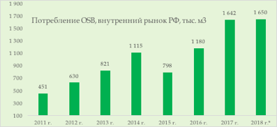 В настоящее время динамично развивающиеся сектор плит OSB в деревообрабатывающей отрасли РФ, ориентирован в большей степени на внутренний рынок страны. В настоящее время внутренний рынок плит OSB формируется в большей степени за счет отечественного производства и импортной продукции. По итогам 2017 года спрос на плиты OSB на внутреннем рынке вырос почти на 40%, что говорит о высоком потенциале производства данной плитной продукции. Рассмотрим динамику насыщения внутреннего рынка страны плитами OSB