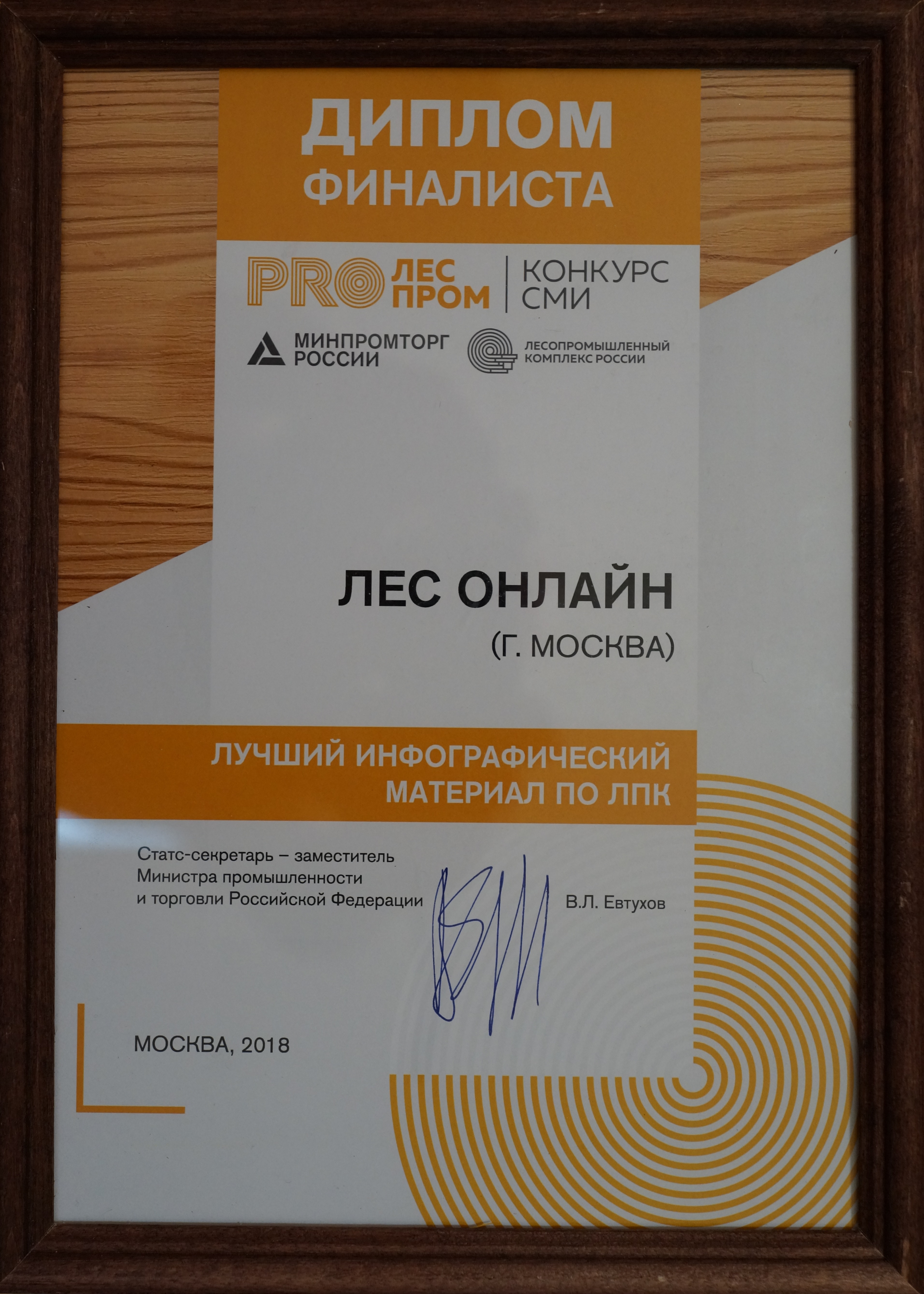 28 ноября 2018 г. в Москве прошла церемония награждения победителей Всероссийского конкурса СМИ «PROЛЕСПРОМ – 2018» Информагенство ЛесОнлайн (г. Москва) вошло в список финаластов по двум номинациям - за лучший информационный ресурс и за лучшую работу в СМИ по проблемам мировой лесной промышленности.