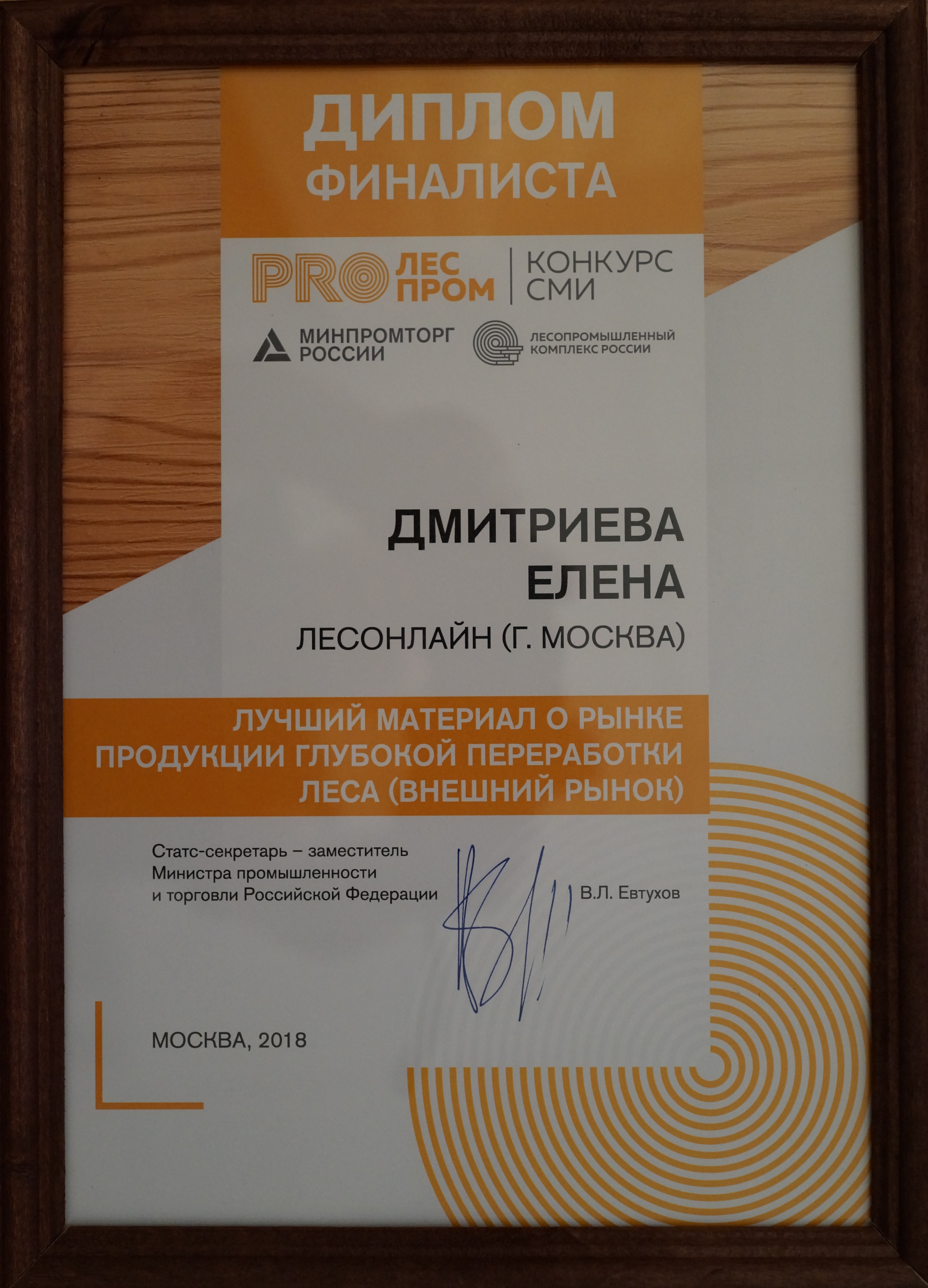 Редактор информагенства ЛесОнлайн награждена за лучший материал о рынке продукции глубокой переработки леса (внешний рынок) На церемонии присутствовали представители Минпромторга России, члены жюри Конкурса, эксперты лесопромышленного комплекса.
