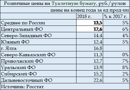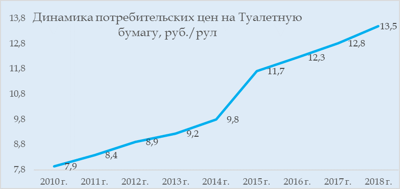 Средние потребительские цены на туалетную бумагу в декабре 2017 года в целом по России установились на уровне 13,5 руб. за рулон, что на 5,3% больше, чем год назад, (в 2017 г. и в 2016 г. цены выросли на 4,2% и 4,5% соответственно, в 2015 году рост цен составил 20%). Цены на востребованном рынке туалетной бумаги растут более высокими темпами, нежели инфляция на непродовольственные товары. Так и в 2018 году средние розничные цены на туалетную бумагу в целом по стране увеличились на 5 п., в то время как потребительская инфляция – на 3 п.