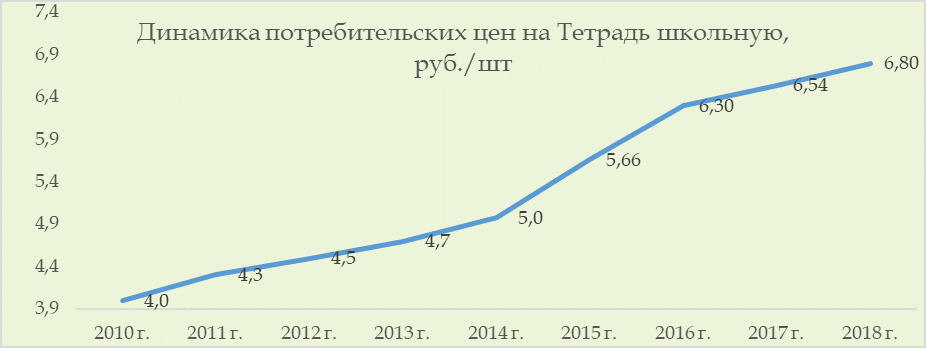 Тетради. Средние потребительские цены, включая НДС, на школьные тетради в декабре 2018 года в целом по России установились на уровне 6,8 руб. за штуку, что на 4% больше, чем в 2017 году. (2017 г. рост 4%). Напомним, что за предыдущие два года потребительские цены на тетради выросли существенно – на 11% в 2016 г. и на 14% в 2015 г.