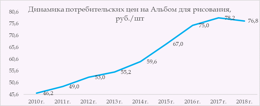 Отметим, что цены на альбомы для рисования предыдущие два года росли высокими темпами, прибавляя каждый год по 12%. Начиная с 2015 года Альбом для рисования дорожал ежегодно в среднем по России на 6% - 8%. В 2014 году рост потребительских цен составил 8%. Источник Росстат Автор Дмитриева Е.Е. © http://www.lesonline.ru/analitic/