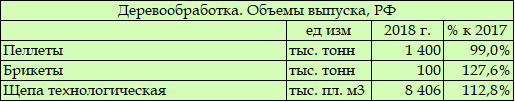 Производство технологической щепы в России в 2018 году демонстрирует высокий рост. Пеллетная продукция отечественной деревообработки в 2018 году впервые за последние десять лет после стабильных темпов роста немного сократилась – спад составил 1%. В секторе «Домостроение» в 2018 году немного выросло производство окон деревянных и дверей деревянных – рост по данным позициям составил соответственно 0,4% и 0,1%. Производство технологической щепы выросло на 13% Наиболее значимая часть технологической щепы уходит в производство целлюлозы, а также плит ДВП, ДСП и ОСП. Технологическая щепа также идет на производство спирта и других продуктов химпрома.