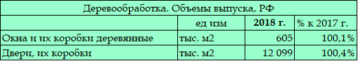 в пеллеты весь объем опилок, производимых комплексом. ООО «Пинежский лесопромышленный комплекс» (входит в ГК «УЛК») в 2018 г. отправил крупную партию пеллет в Бельгию- 5 тыс. тонн древесных гранул. На Сокольском деревообрабатывающем комбинате в Вологодской области в сентябре 2018 г. состоялся запуск пеллетного производства. Проект реализован совместно с компанией "Пелпром Вологда". Мощность производства пеллет 10-12 тыс. тонн в год. АО «Краслесинвест» в Богучанском р-е Красноярского края - запущен Пеллетный завод. Напомним, что Лесопильный завод АО «Краслесинвест» был запущен в июле 2016 года. Вторым этапом создания комплекса по глубокой переработке древесины стал запуск пеллетного завода. Мощность завода – 105 тыс тонн гранул в год. ООО «Устьянский строительный комплекс» (Архангельская область, входит в ГК «УЛК») на площадке Пестовского ЛПК построит пеллетный завод.. Планы строительных работ были утверждены в феврале 2018 г. Производительная мощность нового пеллетного завода в Пестово составит 90 тыс. тонн древесно-топливных гранул в год. В пос. Казлук Усть-Вымского района Республики Коми на ООО «Лесозавод № 1» в августе 2018 г. веден в эксплуатацию цех по производству биотоплива мощностью 6 тыс. т в год. Опилки прессуются в брикеты RUF(прямоугольная форма, «кирпичик»). Сектор «Домостроение» В секторе деревянного домостроения по итогам 2018 года производство деревянных окон и их коробок упало на 1,2%. Напомним, что в 2017 году уровень выпуска окон деревянных вырос на 11%. Всего за год в целом по стране было изготовлено порядка386 тыс. м2 окон и коробок деревянных. По данным за 2018 года в целом по России объемы выпуска деревянных дверей и их коробок и порогов составили 7668 тыс. м2. За отчетный год производство дверей упало на 0,3%. Напомним, что уровень производства деревянных дверей в 2017 году упал почти на 2%.