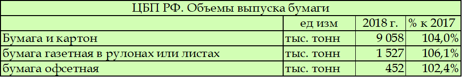 Производственные показатели по выпуску бумаги всех видов и картона в России по итогам 2018 года выросли на 4% и составили в целом по России 9058 тыс. тонн. Производство офсетной бумаги для печати