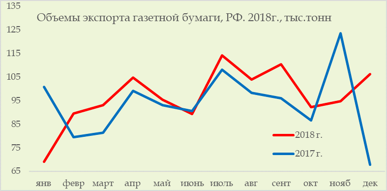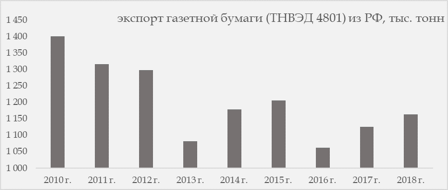 Согласно информации ФТС в 2018 году из России на мировые рынки в совокупности было отгружено свыше 1163 тыс. тонн газетной бумаги (код ТН ВЭД 4801). Объемы поставок газетной бумаги за 2018 год выросли на 3,4% относительно уровня предыдущего года.