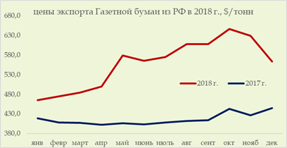 Напомним, чтопосле мирового экономического кризиса объемы поставок отечественной газетной бумаги продолжали падать ещё два года подряд. Стабильные некогда рынки Европы для российских экспортеров газетной бумаги утратили былую привлекательность. Вследствие вялого полиграфического рынка, Германия последние пять лет, ежегодно сокращала закупки газетной бумаги. Традиционный некогда экспорт газетной бумаги в страны Европы стремительно падает, что связано с развитием интернета, использованием электронных книг и таблоидов, вследствие чего газеты постепенно утратили былое значение как источника новостей. Тиражи газет неуклонно падают, снижается и выпуск рекламных проспектов, изготовленных на газетной бумаге. Следует сказать, что до 2014 года основными импортерами газетной бумаги из России выступали страны Европы и Великобритания. После существенного сокращения объемов экспорта по причине обвала спроса в Европе, производители газетой бумаги в России переориентировались на иные мировые рынки сбыта. Интерес к газетной бумаге из России начал стабильно расти предпринимателями из таких стран, как Индия, Турция и других стран. В результате экспорт газетой бумаги начинает вновь расти – в 2014 году физические объёмы экспорта газетной бумаги увеличились на 9%, после чего отгрузки выросли ещё на 2%. Однако в 2016 году экспортерам российской газетной бумаги вновь пришлось сократить поставки – спад составил почти 12%. В 2017 году утраченные объемы экспорта газетной бумаги частично восстановились – объемы поставок выросли за год на 6%. В 2018 году экспортные поставки газетной бумаги продолжили рост, +3%. Импортеры отечественной газетной бумаги Почти половина поставок газетной бумаги сегодня уходит на издательские рынки Индии. В настоящее время российская бумага составляет основу для полиграфии в Индии. До 10% поставок уходит предпринимателям из Турции. Производство газетной бумаги в Турции отсутствует, так что Россия обеспечивает почти половину тиража турецких газет. Потоки отечественной газетной бумаги сегодня уходят также на рынки Пакистана, Германии. До 4-х процентов уходит на рынки Китая. Во второй половине 2000-х Китай вообще практически прекратил ввозить газетную бумагу, в начале 2010-х пошли крупные закупки из Кореи, в 2017 г. активизировались и другие страны, Россия претендует на долю 8-10%. Для Украины Россия остается доминирующим поставщиком с долей примерно 75%. Перечислим еще несколько импортеров отечественной газетной бумаги - Иран, Финляндия, Египет, Казахстан, Узбекистан, Болгария, Израиль и другие страны. Внешнеторговые цены на газетную бумагу В 2018 году газетная бумага из России подорожала существенно. В 2018 году цены на газетную бумагу в декабре 2018 г. составили 564 долл. за тонну. Экспортные цены с начала года выросли на 27%. Следует напомнить, что российская газетная бумага в 2017 году подорожала на 7%.