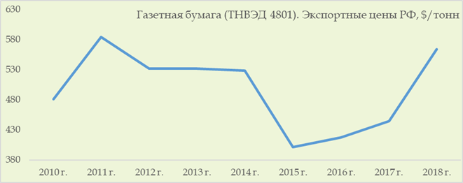 Напомним, что в 2015 году произошел буквально обвал мировых цен, по которым реализовывалась продукция Лесной промышленности России. В большей степени в этот период упали внешнеторговые цены на газетную бумагу – спад составил 24%. В 2016 году экспорт газетной бумаги подорожал в отличие от других основных экспортных товаров Леспрома – рост небольшой, на уровне 4%. В 2017 году цены на отечественную газетную бумагу понемногу восстанавливаются, рост составил 7%. В 2018 году зафиксирован значительный рост цен на газетную бумагу из РФ.