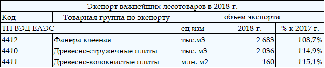 В перечень важнейших экспортных товаров России входят такие, товарные группы Лесной промышленности, как - необработанные и обработанные лесоматериалы, фанера, целлюлоза и газетная бумага. Последнее время растет экспорт древесных плит. По отгрузкам пеллет Россия уже занимает лидирующие позиции. Экспорт древесных плит В 2018 году существенно выросли экспортные отгрузки древесно-волокнистых и древесно-стружечных плит. Так по итогам 2018 года экспорт ДВП вырос на 15,1%, составив в целом по России 160 млн м2. Экспорт ДСП в 2018 году увеличился почти на 15%. Всего за 2018 год был отгружено около 2036 тыс. м3 плит ДСП. Следует отметить, что по итогам 2018 года доля экспорта плит ДСП составила 15% от совокупного объема выпуска. Экспортная доля от производства плит ДВП составила около 15,6%.