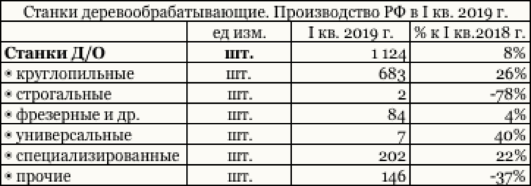 Производство различных видов деревообрабатывающих станков в целом по России 1 кв. в 2019 г., изменение объемов к аналогичному периоду предыдущего года