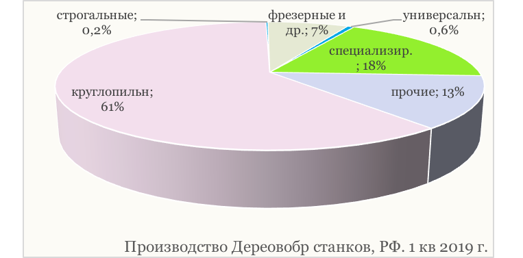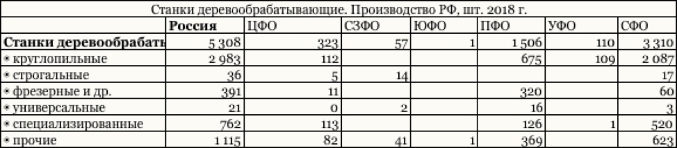 Наиболее широкое распространение деревообрабатывающих станков в настоящее время представлено такими станками, как «Станки деревообрабатывающие круглопильные, ленточнопильные и лобзиковые». В основном такие станки изготавливают в Сибирском ФО, доля 70%. В Приволжском ФО производят около 23% отечественного выпуска круглопильных деревообрабатывающих станков. см Инфографика https://www.lesonline.ru/news/?cat_id=25&id=386816 см.Цены https://www.lesonline.ru/analitic/?cat_id=12&id=374114 Использованы статданные ФСГС, информация Минпромторга, Минэкономразвития Е. Дмитриева
