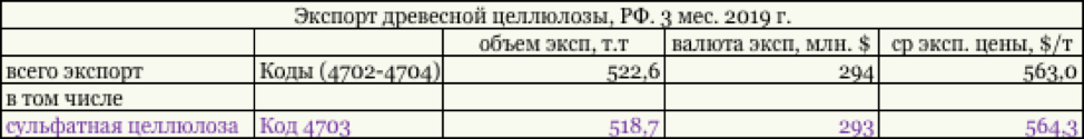 Важно учитывать, что экспортная целлюлоза – это так называемая товарная целлюлоза, т.е. уже максимально обезвоженная и прессованная, после чего упакована в специальные пачки для отправки. Напомним, что за первые три месяца 2019 г. в соответствии с данными Росстата уровень производства сульфатной целлюлозы в целом по стране составил 1449 тыс. тонн, что на 1% меньше, чем год назад за такой же период. Производство сульфатной целлюлозы по итогам 1 кв. 2019 г. составляет 68% от совокупного объемы производства древесной целлюлозы. На долю сульфитной целлюлозы приходится 4%. Объемы выпуска древесной массы в структуре выпуска древесной целлюлозы занимают долю 28%.