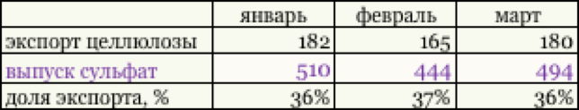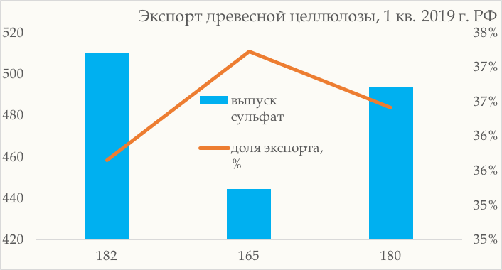 Характеризуя динамику экспортной доли целлюлозы, отметим, что в течение первых трех месяцев 2019 г. данный параметр находился в интервале 36% - 37%.