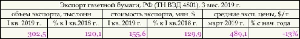 По состоянию на март 2019 года внешнеторговые цены на отечественную фанеру составили в среднем 439,8 $/м3, за период с начала года цены упали на 6% Подробнее см. Инфографика https://www.lesonline.ru/news/?cat_id=25&id=379376 https://www.lesonline.ru/news/?cat_id=25&id=379377 Экспортные поставки газетой бумаги в I кв. 2019 г. увеличились на 20% По итогам I кв. 2019 г. из России на мировые рынки в совокупности было отгружено свыше 302 тыс. тонн газетной бумаги (бумага газетная в рулонах или листах, код ТН ВЭД 4801). Объемы поставок газетной бумаги по итогам I кв. 2019 г. выросли более, чем на 20% в сравнении с таким же периодом предыдущего года.