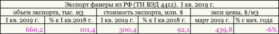 По состоянию на март 2019 года внешнеторговые цены на отечественную круглую древесину составили в среднем 76,5 $/м3, за период с начала года цены выросли на 7%. Подробнее см. Инфографика https://www.lesonline.ru/news/?cat_id=25&id=379372 https://www.lesonline.ru/news/?cat_id=25&id=379373 Экспортная фанера в марте 2019 г. подешевела на 6% Экспорт фанеры клееной (фанера клееная, панели фанерованные и аналогичные материалы из слоистой древесины, код ТН ВЭД 4412) по итогам I кв. 2019 г. в натуральном выражении в целом по стране составил 660 тыс. м3. Объемы экспорта фанеры за I кв. 2019 г. выросли на 1,4% относительно уровня аналогичного периода предыдущего года.