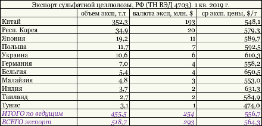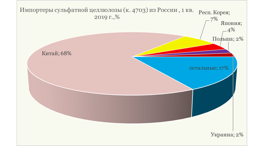Прежде всего отметим, что на экспорт из России в основном отгружается сульфатная целлюлоза (код 4703). Подробнее см. https://www.lesonline.ru/analitic/?cat_id=12&id=386905 и https://www.lesonline.ru/analitic/?cat_id=12&id=386824 Главным направлением российского экспорта древесной целлюлозы остается Китай, доля экспорта в наутральном выражении составляет 68%. Таблица. Ведущие импортеры российской древесной целлюлозы, 1 кв. 2019 г.