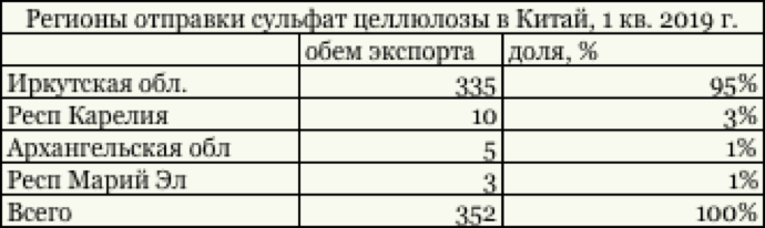 Основные поставки отечественной древ. целлюлозы уходят на рынки КНР, доля поставок в совокупном экспорте в 1 кв. 2019 г. составила 68%. Основной объем экспортных поставок сульфатной целлюлозы в КНР отправляется с Усть-Илимского ЦБК. Таблица. Регионы отправки древесной целлюлозы на рынки КНР
