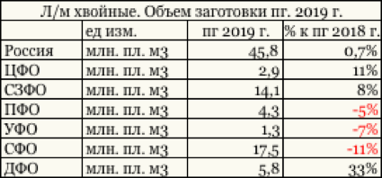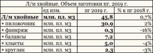 Основной рост по уровню лесозаготовительных работ за рассматриваемый период зафиксирован по вывозке пиловочного сырья. Относительно аналогичного уровня предыдущего года заготовка хвойного пиловочника выросла на 2%. При этом резко сократилась заготовка хвойного фанкряжа. Немного выросла заготовка балансовой древесины. В тоже время упали объемы вывозки хвойных хлыстов и лесоматериалов, используемых в круглом виде. По итогам полугодия 2019 г. доля вывозки пиловочного сырья в объемах заготовки хвойных лесоматериалов в целом по стране составила 67%. Вывозка хвойных балансов – 15%, На хлысты приходится 13%. Круглые хвойные лесоматериалы занимают по объемам долю 5%, а вывозка фанкряжа 1%.