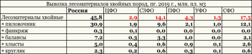 По итогам полугодия 2019 г. наибольший прирост лесозаготовительных работ по вывозке хвойных лесоматериалов приходится на ДФО, рост составил 33% к уровню полугодия 2018 г. На 11% выросли объемы лесозаготовки в ЦФО. Лесозаготовители СЗФО увеличили объемы вывозки хвойных лесоматериалов на 8%. Снижение объемов вывозки хвойных лесоматериалов за рассматриваемый период было зафиксировано по СФО, спад составил 11%. В ПФО и в УФО уровень вывозки хвойной древесины за полгода 2019 г. упали на 5% и 7% соответственно.