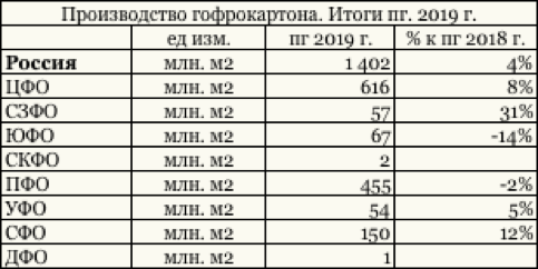 Высокий рост выпуска гофрокартона за истекший период зафиксировано в СЗФО, рост составил 31%. На 8% увеличилось производство гофрокартона в ЦФО. Производители УФО и СФО нарастили объемы на 5% и на 12% соответственно. В ЮФО выпуск гофрокартона упал на 12%. Немного сократилось производство гофрокартона в ПФО. По состоянию на июль 2019 г. ведущим регионом по выпуску гофрокаритона выступает ЦФО, на долю которого приходится 44%. Второе место по объемам выпуска гофркартона занимает ПФО с долей 32%. В СФО сегодня производится около 11% совокупного выпуска гофрокартона страны. В СЗФО, ЮФО и УФО выпускают примерно по 4% от уровня производства в РФ. См. Инфо - Выпуск https://www.lesonline.ru/news/?cat_id=25&id=385194 Основные события на рынке гофрокартона по итогам п/г 2019 г.: «Челны Упак» (г. Клин, ИП «КлинАвтоТранс», Московская обл., дочка НЧ КБК) 24 июня 2019 г. открылось новое предприятие по производству гофрокартона и бумтары ООО «ЧелныУпак».К 2020 г. мощность предприятия увеличится до 12 млн м2 гофротары в месяц. Воронежский ф-л «АРХБУМ» (Воронежская об., ИП «Масловский», дочка АЦБК) В мае 2019 г. АО «Архбум» ввело в эксплуатацию новый завод по производству гофрокартона и гофроупаковки. Мощность предприятия - 188 млн м2 продукции в год. В 2019 году планируется выпустить 130 млн м2 продукции. А в 2020 году Воронежская площадка «Архбум» выйдет на показатель 188 млн м2. SFT Group 30 апреля 2019 г. SFT Group подписала соглашение о создании совместного предприятия и продаже 50% акций концерну Prinzhorn Group (Вена, Австрия) Подольский ф-л «АРХБУМ» (г. Подольск, Московская обл., дочка АЦБК, Pulp Mill Holding) В марте 2019 г. в рамках комплексной модернизации введен в эксплуатацию новейший агрегат ПВА Emba 175QS Ultima (Швеция). После завершения модернизации Подольский филиал АО "Архбум" сможет производить более 200 млн кв. м гофропродукции в год ЗАОР "НП НЧ КБК им. Титова (г. Набережные Челны, Р. Татарстан) В марте 2019 г. НП НЧ КБК им Титова включен в список приоритетных проектов, В проект модернизации картонной фабрики входят работы по увеличению мощности производства картона для плоских слоев гофрокартона и бумаги для гофрирования. АО «Смерфит Каппа Санкт-Петербург»(г. Всеволожск, Ленобласть; Smurfit Kappa) 2018 г. - АО «Смерфит Каппа Санкт-Петербург» получило награду Quality Award за высокое качество выпускаемой продукции. На рынке гофропродукции в России в 2018 г. появилось новое предприятие - Тольяттинская бумажная фабрика В 2018 году начато производство гофрокартона на новом предприятии «Новосибирский КБК» (Пос. Красный Яр, Новосибирская обл.) на базе обанкроченного «ПК «Красный Яр» и «Сибсельма» Летом 2018 г. начало работать производство первичного гофрокартона 150 млн. м2, бумага для гофрирования, производство гофроупаковки (гфроящики – коробки для пиццы – упаковка для холодильников) составит 72 млн. м2 в год. В 3 кв. 2019 г. начнет работать производство бумаги 30 тыс. тонн и картона из макулатуры. Орловский бумажный комбинат (г. Орел). Планируется запуск современного производства по глубокой переработке вторичного бумажного сырья. План – расширение мощностей по выпуску трехслойного гофрокартона и упаковки. Производственные мощности позволят выпускать до 60 тыс. тонн бумаги в год. Запуск в 1 кв. 2019 г. Завод гофротары «Европак» (Pulp Mill Holding) был открыт в индустриальном парке «Масловский» Воронежской области. Летом 2019 года «Европак» будет полностью интегрирован в АО «Архб