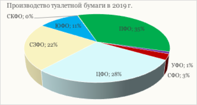 ЦФО также входит в число ведущих регионов по выпуску туалетной бумаги. По состоянию на 2019 г. на долю этого региона приходится почти 28% российского выпуска туалетной бумаги. За период с января по июнь 2019 г. производство туалетной бумаги в ЦФО составило 684 млн. рул., что на 11% больше, чем год назад за такой же период. Прежде всего отметим, что в янв. 2019 году состоялся запуск нового завода по выпуску санитарно-гигиенической продукции – «Архабум Тиссью Групп» (п. Ворсино, Калужская обл.; дочка АЦБК, Pulp Mill Holding GmbH). Запуск 2-й линии нового завода запланирован на июль 2019 г. В число ведущих предприятий по выпуску СГИ, расположенным в ЦФО относятся две фабрики компании Essity, расположенные в Тульской области - Фабрика (г. Советск) и Фабрика (г. Венев). С 2014 г. на рынке СГИ работает предприятие Сыктывкар Тиссью Групп (в Ярославской обл., г. Ростов); На территории ЦФО производством СГИМ заняты также такие компании, как «Кимберли-Кларк». Частично туалетную бумагу выпускают Кондровская БК, Адищевская БФ и Костромская БФ. Производство туалетной бумаги налажено на таких предприятиях, как ПКФ «Чистый дом»; «Семья и Комфорт»; «Добрый моток», «НРБ-Групп» и др. Ранее СЗФО лидировал в производстве туалетной бумаги. В настоящий момент доля этого региона составляет около 22% отечественного производства туалетной бумаги. Производство туалетной бумаги в СЗФО за полгода 2019 г. составило 539 млн. рулонов, что на 6% меньше, чем год назад за аналогичный период. В число ведущих предприятий по выпуску туалетной бумаги в СЗФО входят такие, как: Фабрика (г. Светогорск, Ленобласть; Essity, ранее SCA); «Сыктывкар Тиссью Групп» (завод в Республике Коми) и Сясьский ЦБК (Ленинградская обл.); Среди небольших предприятий региона назовет такие, как «Атлас-Маркет»; «Квартет» и «Альфа ОП»; Компания «Вива» и др. Вельгильская бумажная фабрика в числе прочей бумажной продукции выпускает туалетную бумагу и бумажные полотенца. Доля ЮФО в производстве туалетной бумаги составляет 11%. За период с января по июнь 2019 г. выпуск данной продукции в ЮФО превысил 258 млн. рул., спад 4%. В число предприятия этого округа входят такие, как: Бумажная фабрика (Ростов-на-Дону); Кубань-Папир (Краснодарский край); Бумажная ф-ка компании Constell Group (Республика Адыгея) и др. На СФО приходится до 3-х процентов совокупного выпуска туалетной бумаги в России. За полгода 2019 г. в СФО было выпущено около 67 млн. рул, спад 7%. В СФО работает Компания «Велеск», расположенная в г. Омске и др. Производство туалетной бумаги в УФО – невелико и составляет немногим более одного процента. За полгода выпуск туалетной бумаги в УФО составил 22 млн. рул., что на 14% меньше, чем за полгода 2018 г. В УФО расположено предприятие ФБИ "Никмас", расположенное в Челябинске, и др.