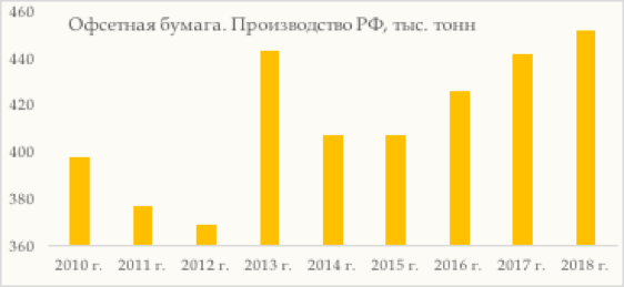За 2018 год в целом по стране производство офсетной бумаги для печати составило 452 тыс. тонн. Объемы выпуска «офсетной бумаги для печати» в 2018 году выросли на 2,4%в сравнении с показателями предыдущего года. Следует напомнить, что производство офсетной бумаги для печати растет третий год подряд. В 2016 г. и в 2017 г. темпы роста составили 5% и 4% соответственно. В 2018 году рост выпуска продолжился. Тенденции Рынка офсетной бумаги в России- Российский рынок офсетной бумаги растет три года подряд. По итогам полугодия 2019 г. наблюдается отрицательная динамика. - В структуре рынка офсетной бумаги в 2018 году внутреннее производство превышало объем импортных поставок более чем в 18 раз., а сальдо торгового баланса было положительное и составляло 184,4 тыс. тонн.