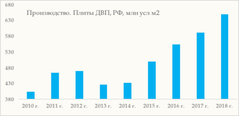 Производство плит ДВП в России растет четвертый год подряд высокими темпами. За последние пять лет совокупные объемы выпуска ДВП российскими предприятиями выросли почти в полтора раза. Диаграмма. Динамика выпуска плит ДВП в России, начиная с 2010 г.