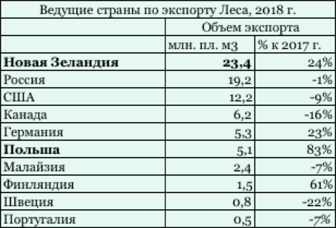 Незначительная доля экспорта в совокупном объеме выпуска промышленного круглого леса можно объяснить тем, что США, выступая мировым лидером по выпуску промышленной древесины, отгружает на экспорт всего 3% от объема заготовки в стране. Россия, второй мировой лидер, поставляет на мировые рынки 9% от объема лесозаготовки промышленного кругляка страны. В список десяти стран, лидирующих по объемам экспорта неотесанной круглой древесины по итогам 2018 года вошли такие страны, как Новая Зеландия, Россия, США, Канада, Германия, Польша, Малайзия, Финляндия, Швеция и Португалия. Эти десять стран обеспечивают свыше 57% мирового экспорта промышленного круглого леса. Торговлей промышленного леса заняты также такие страны, как Бразилия, Чили, Китай, Беларусь, Индонезия и др. Однако экспорт делового круглого леса в этих странах невелик. Продолжительное время безусловным лидером по экспорту круглого леса промышленного назначения выступала Россия. Начиная с 2018 года лидерство по объемам отгруженного делового кругляка закрепилось за Новой Зеландией. Интересно отметить, что эта страна экспортирует 80% промышленного леса, заготовленного в стране. Россия же отправляет на экспорт всего 9% от объема заготовок делового круглого леса страны. Итоги 2018 года по объема экспорта делового круглого леса мировыми лидерами по объемам поставок
