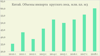 Последние пять лет лесозаготовители Поднебесной стабильно заготавливают около 163 млн. пл. м3 делового круглого леса. По данным показателям Китай занимает третье место в мире после США и России. Практически весь заготовленный в КНР круглый лес используется для дальнейшей обработки на внутреннем рынке. По итогам 2018 г. Китай сохранил объемы лесозаготовки на прежнем уровне. Наращивая импорт круглого леса, в 2018 г. Китай увеличил закупки леса в натуральном выражении на 8% до 60,2 млн. пл. м3. Объем потребления делового круглого леса в прошедшем году составил свыше 223 млн. пл. м3. Для сравнения – потребление круглого леса в России в 2018 г. составило 200 млн. пл. м3. При этом необходимо учитывать, что Китайское правительство приняло решение о выведении всех природных лесов из промышленного освоения к 2020 году. Также государственным лесным плантациям КНР предписано сократить вырубку искусственных лесонасаждений на 20%. Отказ Китая от коммерческих рубок в лесах будет способствовать увеличению потребности импорта необработанной древесины. Несмотря на высокие показатели лесозаготовительной деятельности Китай закупает значительные объемы леса в других странах, став за последние пятнадцать лет безусловным лидером по импорту кругляка. Ежегодно наращивая импорт круглого леса экономическое развитие Поднебесной стало определяющим фактором в глобальном товарообороте кругляка. В 2018 году на долю импортных поставок круглого делового леса в Китай приходится 45% глобального объема поставок. По итогам 2018 г. на рынки Китая было отгружено 60,2 млн. пл. м3 делового круглого леса, в том числе пиловочник – в размере 59,7 млн. пл. м3. Половина импорта приходится на пиловочник хвойных пород – 30,7 млн. пл. м3. Объем импорта лиственного пиловочника достиг 18 млн м3, рост 6%. Лиственное пиловочное сырье тропических пород древесины - свыше 11 млн пл. м3, рост 15%. Характеризуя кривые роста импорта круглого леса в Китай, отметим, что КНР за последние десять лет только дважды сокращал импорт делового круглого леса – в 2012 г. и в 2015 г. Последние же три года китайский импорт кругляка в натуральном выражении демонстрируют ежегодный прирост. Так в 2016 г. китайский импорт кругляка вырос на 5%, в 2017 г. на 6%. В 2018 году поставки круглой древесины в Китай выросли еще на 8%.