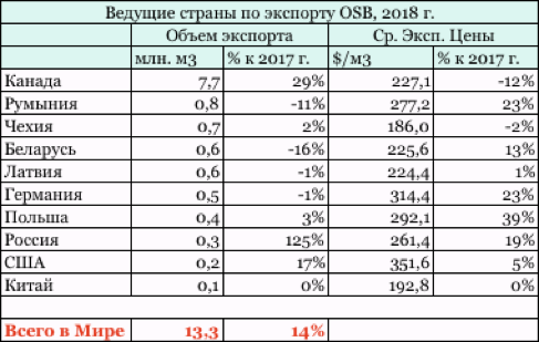 Мировым лидером по поставкам ориентированно-стружечных плит на мировые рынки является Канада. Доля страны в мировом товарообороте в настоящее время составляет 58%. Ведущими экспортерами плит OSB также выступают такие страны, как Румыния, Чехия, Беларусь и Латвия. Экспорт OSB сегодня также налажен в таких странах, как Германия, Польша, Россия, а также США и Китай. Экспортеры плит OSB По итогам 2018 г. высокий рост по объемам экспорта плит OSB зафиксирован по таким странам, как Канада и Россия. При этом внешнеторговые цены на OSB их Канады в этом году упали на 12%, плиты OSB из России, напротив, подорожали на 19%. За рассматриваемый период снижение уровня поставок в сравнении с предыдущим годом отмечено в таких странах, как Румыния и Беларусь. При этом цены на OSB из Румынии выросли на 23%, OSB из Беларуси подорожали на 13%. Таблица. Объемы экспорта плит OSB и среднестатистические цены на OSB по странам-лидерам глобальной торговли в 2018 г.