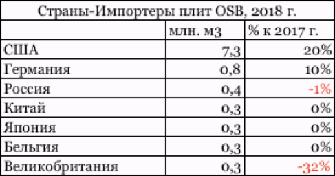Среди стран, лидирующих по импорту OSB, назовем также такие, как Германия, Россия, Япония, Китай, Бельгия и Великобритания. По итогам 2018 года зафиксирован рост поставок OSB в портах Германии – всего в Германию было отгружено свыше 840 тыс. кубометров плит OSB, что на 10% больше, чем год назад. Импорт OSB в Великобритании по итогам 2018 года упал на 32%, составив 258 тыс. м3.