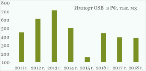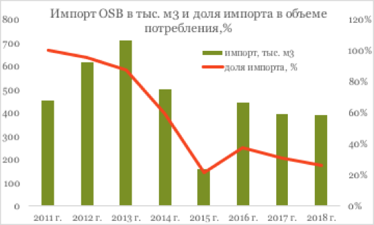 Импорт ориентированно-стружечных плитв России падает. В 2018 г. доля импортных поставок в общем объеме потребления составила 26%. Для сравнения – пять лет назад доля импорта составляла 59%. Ожидается, что тенденция вытеснения импортных ориентированно-стружечных плит на российском рынке будет продолжаться. Вообще, процесс импортозамещения продукции, поставляемой из-за рубежа сегодня считается актуальным и привлекает особое внимание российских властей по налаживанию отечественного производства. Использованы статданные ФАО ООН, ФТС, Росстат, а также Стратегия развития лесной отрасли до 2030 г. Е. Дмитриева
