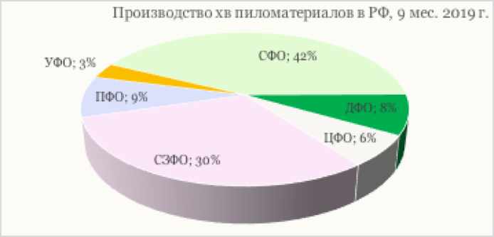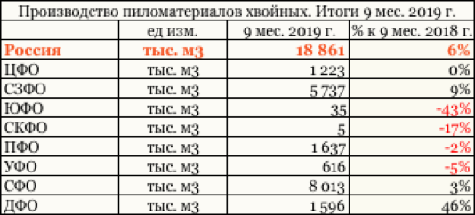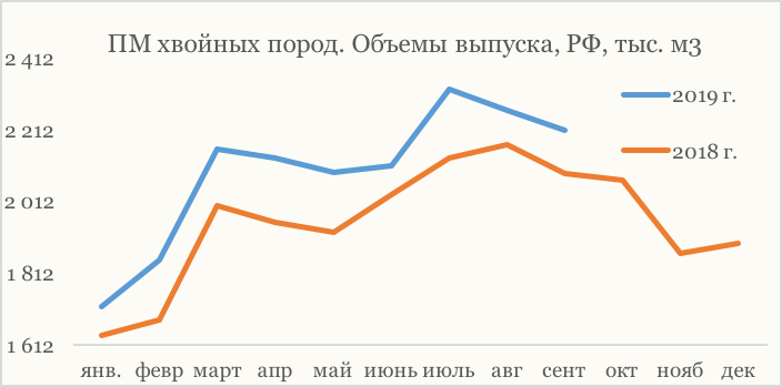 Производство хвойных пиломатериалов, РФ, 9 мес. 2019 г.